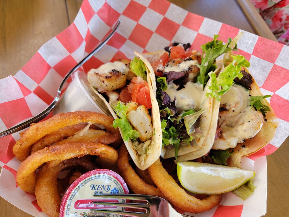 Fresh fish or pink shrimp in our case that day fried, grilled or blackened with spring mix, cabbage, tomato and key lime mustard sauce served in our soft tacos served with cole slaw plantain chips. Flour or corn tortilla